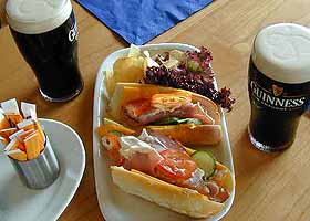 最上階のカフェで昼食を取り、入場料に含まれているギネスを飲む。サンドウィッチが美味しかった。そうそう、ストア・ハウスのみやげ物屋もなかなか良かったです。ギネス・グッズがたくさんあって、洒落てます。おつうとKanaoはポロシャツを買いました。
