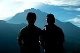 バンに乗ること小一時間、山道に入っていた我々の視界が突然開け、眼前に威風堂々としたキナバル山が立ち現れる。山の北西からアプローチしているので、山は逆光の中に聳えている。ここでしばし休息。記念写真を撮りながら、思いは既に山の上に飛んでいる(写真右:プライバシー保護のため、ロビー氏とkanaoを逆光にて撮影しております(笑))。
