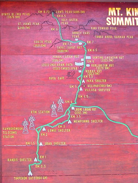 登山口の手前には大きな木製の掲示板があり、多くの人たちの名前と時間が刻まれている。登山マラソンの成績だ。速い人はキナバル山山頂までの標高差2500mあまりをX時間強で駆け上がるらしい(←すみません、メモするのも撮影するのも忘れました)。人間技じゃない。このマラソンは年に一回開催されているそうだ。健脚に自信のある方は、試してみると良いだろう。御健闘をお祈りする。