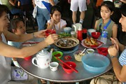 さて、お昼は隣のエバーグリーンホテルのランチ・ビュッフェ。Kanaoの昔の同僚の内、中華系の仲間5人が集まってくれた。2年前、帰国前のKanaoをこの同じビュッフェに招いてご馳走してくれたのが彼らで、今回は、私が彼らを招待した。オタオタを食べ、チキンカレーを食べ、サテーを食べ、ココナッツプリンを食べ・・・昔の事や他の人たちの消息話に花を咲かせた。皆、新しい仕事を見つけているのを知り、ほっとした。2年間の間に女の子の一人は結婚し、大きなお腹をして旦那を連れてきた。皆、外見は殆ど変わりなかった。お腹の大きな一人を除いて。彼ら同士も殆どが2年ぶりの再会とのことで、私のペナン訪問は彼らにとっても良い再会のチャンスとなったようだ。楽しい2時間弱があっという間に過ぎ、お別れの時間となった。一人一人にお土産を手渡し、2年前と同じ場所で記念写真を撮る。