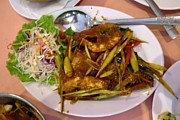 さて、このレストランに行くのなら、是非、食べたかった物がある。前菜のミャンカム。小皿に出されたナッツや薬味などを、タイチャプールという葉で包んで食べるものだ。「ハニー・シー・ココナッツ・ジュース!妻はスターフルーツ・ジュース。それとミャンカム」「すみません、ミャンカムはありません」。えーーーーーー。私がこのレストランに来た意味の30%ぐらいは吹っ飛んでしまった。