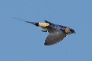 [特徴] 現在まで、飛んでいる姿しか観察できていない。大型なため体力があるのだろうか、いつまでも飛び回っている。14cmクラスのリュウキュウツバメが頻繁に建物のひさしや木の枝に止まって休んでいるのとは対照的。飛び方も、リュウキュウツバメやツバメがヒラヒラと方向を変えて飛び回るのに対し、コシアカツバメは翼を大きく広げて滑空する姿が良く観察される。そのおかげで、飛行中の写真を撮るのは比較的容易。