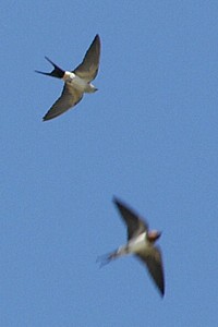 左にツバメとコシアカツバメのニアミスを示す。ツバメの頭部が黒く見え、コシアカツバメが黒いタイツをはいたように見えるのが良く分かる。
