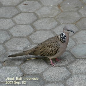 [外観] 首に特徴的な点状の模様がある。日本でも見られるキジバトに似るが、キジバトの首の模様は縞状であること、キジバトよりやや小型で尾が長いこと、などの違いがある。